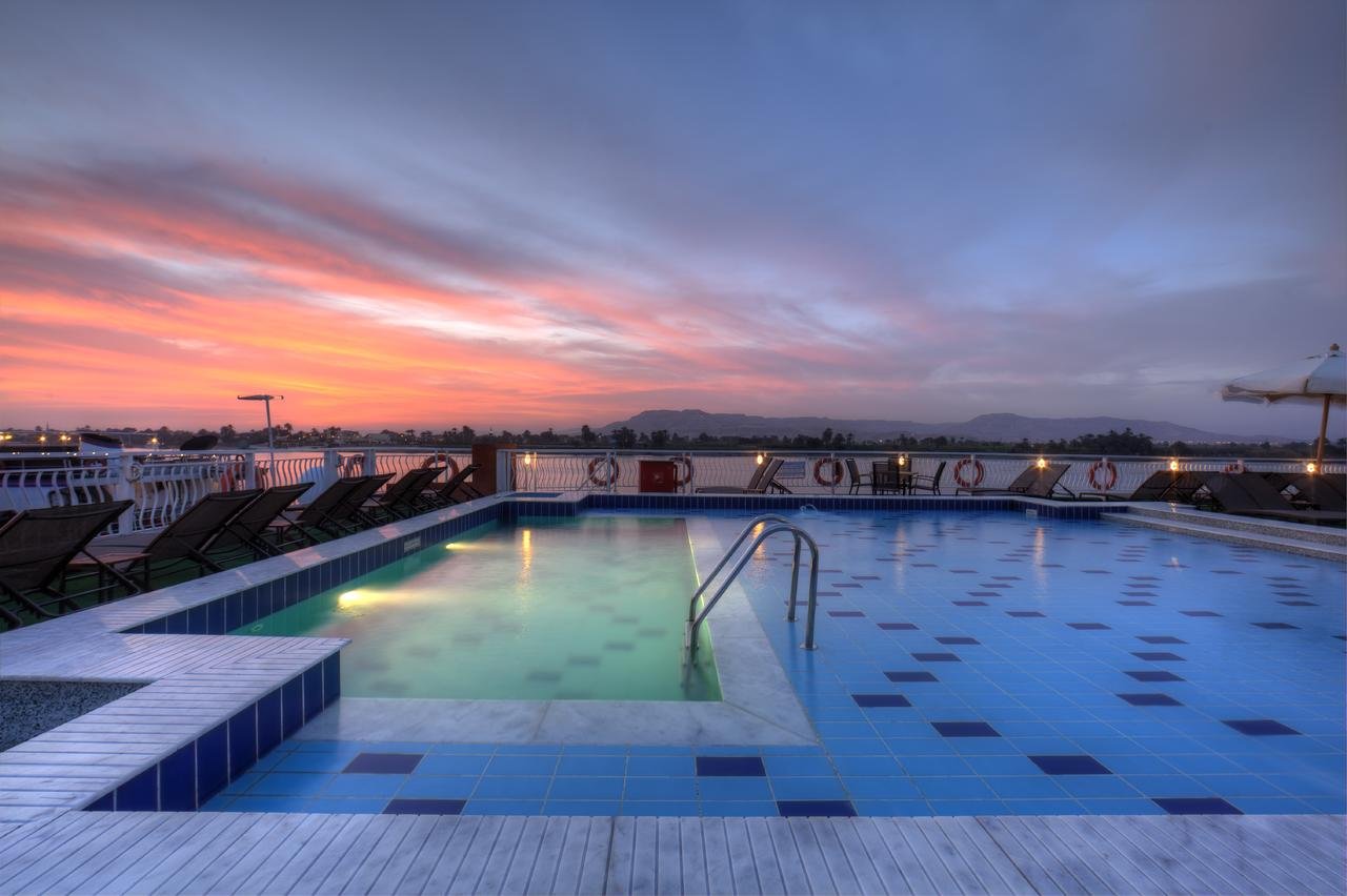The Steigenberger Minerva Nile Cruise is designed to provide relaxation and entertainment in equal measure. The ship boasts a spacious sun deck with loungers and a pool, offering the perfect setting to enjoy the warmth of the sun while soaking in the magnificent views of the Nile.